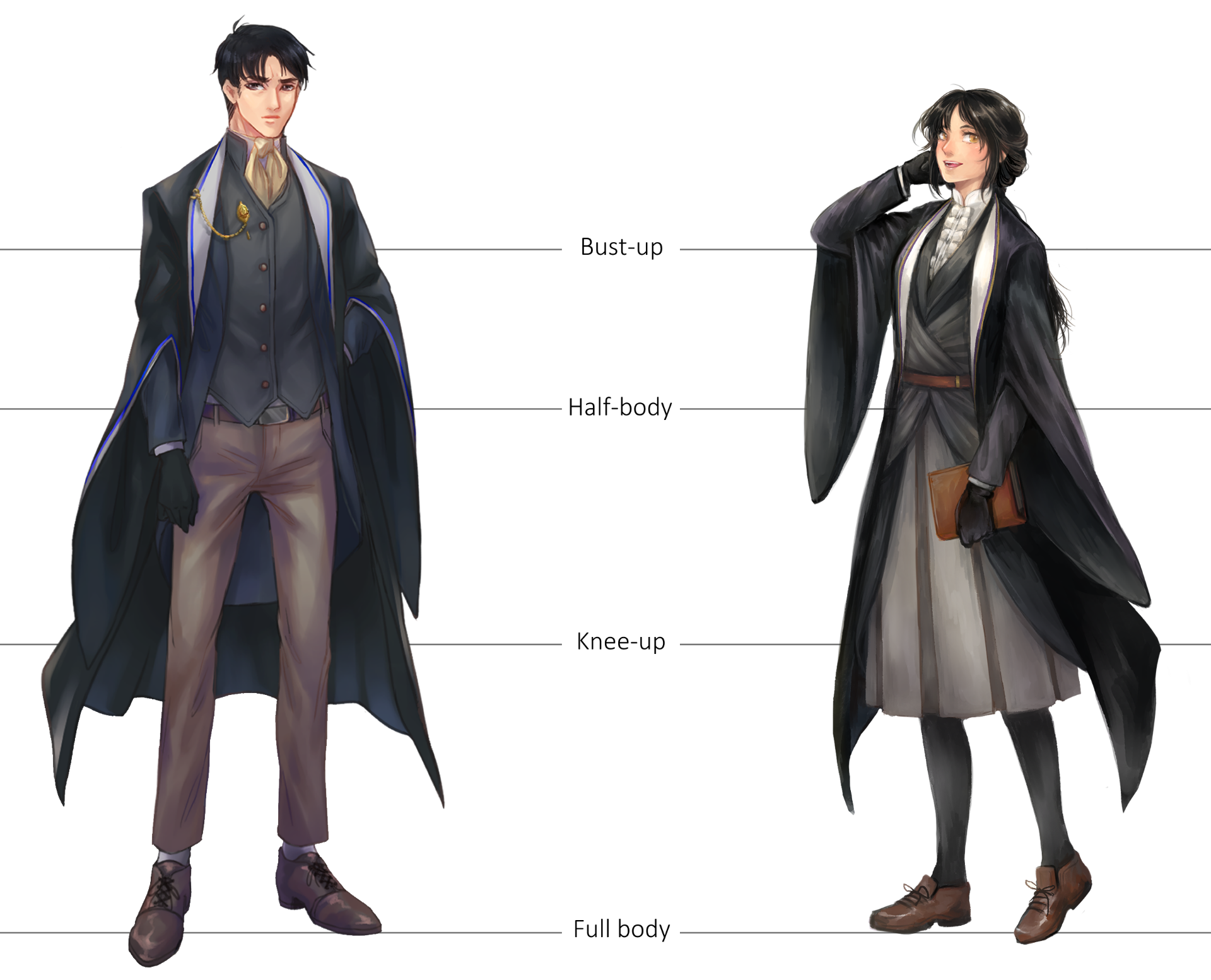 type of commission: ex. Colored full body(Type A) 2 characters in same picture.